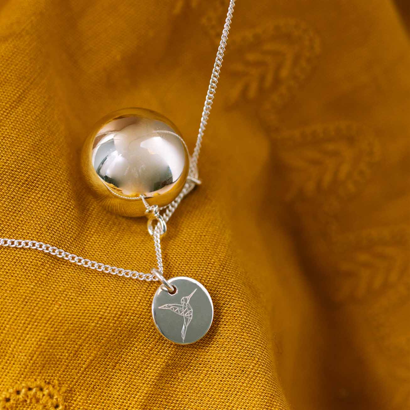 En Aismée, os acompañamos en todas las historias de vuestra vida y de vuestra familia, y queremos apoyaros. Os dedicamos esta joya de embarazo. Este modelo plateado consta de un medallón con símbolo de colibrí y otro medallón en el cual podéis elegir grabar una o dos iniciales. La cadena mide 110 cm y es ajustable a 95 cm gracias a una anilla intermedia, ideal para seguir la evolución de vuestra barriga y morfología.