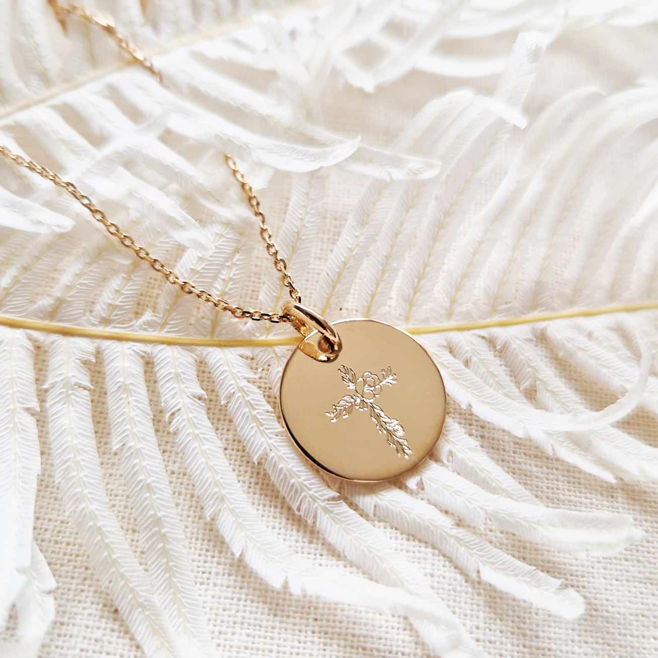 En esta medalla, hemos elegido presentar una cruz única y primaveral, la Cruz Floreada. Ha sido diseñada por Lena, nuestra ilustradora, con corazón para ayudarte a querer a tu ahijada. Este collar de bautizo puede personalizarse en el reverso con el nombre y la fecha del bautizo, por ejemplo. El nombre se escribirá en un bonito tipo de letra inglesa y la fecha en un tipo de letra de palo.