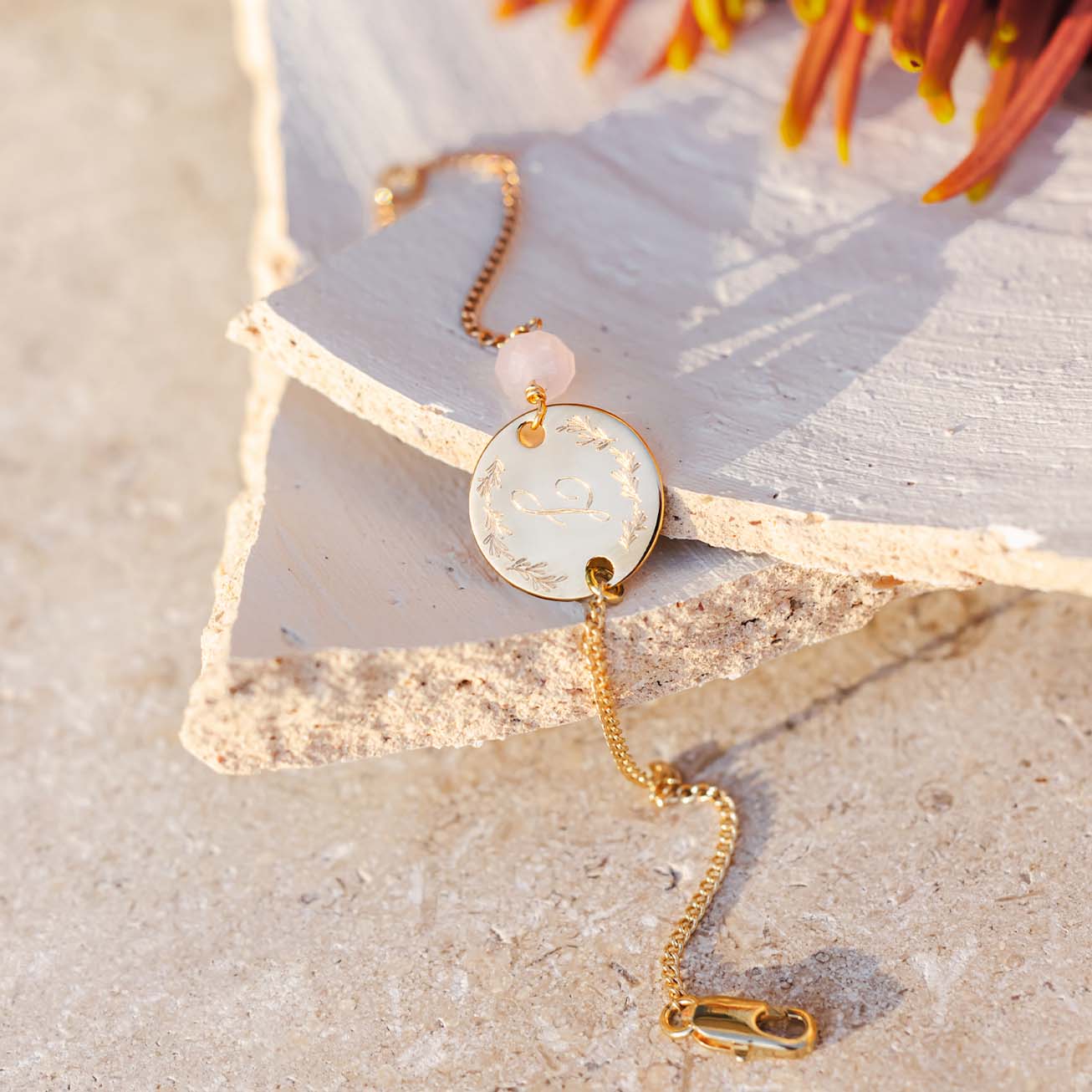 Esta pulsera, chapada en oro de 18 quilates, consta de una medalla de 15 mm en la que se podrá grabar la inicial del niño bautizado o de la niña que se bautiza. Adornada con una corona de flores, su inicial queda como protegida y embellecida por todo vuestro amor.